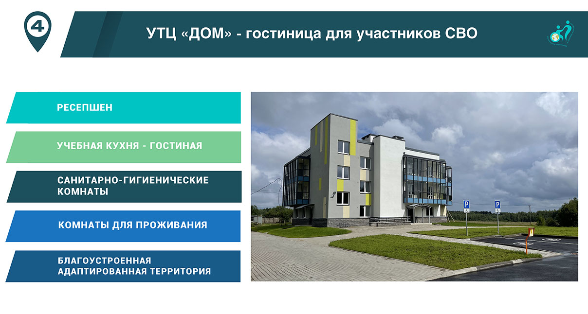 Гостиница для участников СВО – отдельно стоящее трехэтажное жилое здание с адаптированной жилой средой, предназначенное для получения навыков самообслуживания и повышения автономности граждан, имеющих ампутации и другие нарушения функций организма (в том числе, сенсорные).