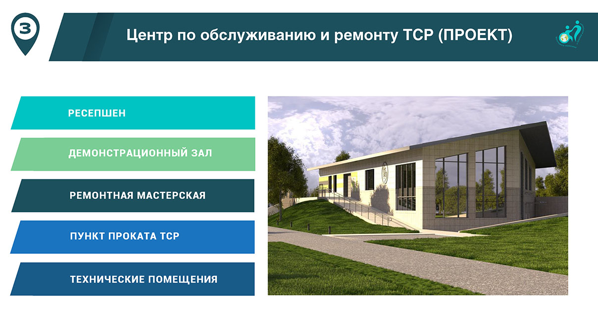 Центр по ремонту и обслуживанию технических средств реабилитации – отдельно стоящее одноэтажное здание, расположенное в шаговой доступности от Мультицентра, оказывающее максимальный объем профессиональных услуг по ремонту ТСР. Начало строительства запланировано на 2025 год.